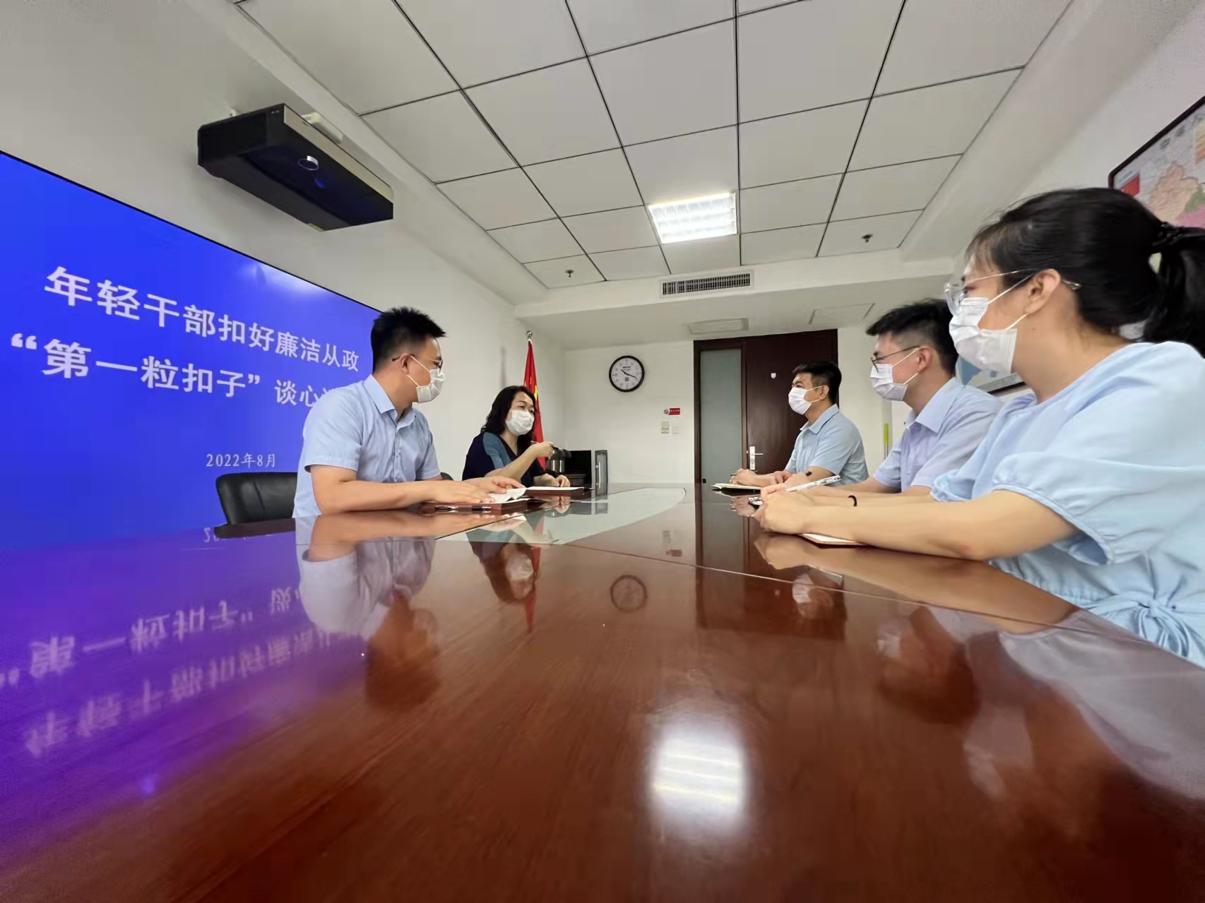 山东省威海市纪委监委针对一些年轻干部纪法意识不牢固、工作作风不扎实等问题,紧盯重点领域、关键岗位,聚焦新入职公务员等重点群体,深入开展“年轻干部扣好廉洁从政第一粒扣子”谈心谈话活动,引导年轻干部成为党和人民忠诚可靠的干部。图为该市纪检监察干部在市人社局对年轻干部进行谈心谈话。王荷云 王柬力 摄影报道
