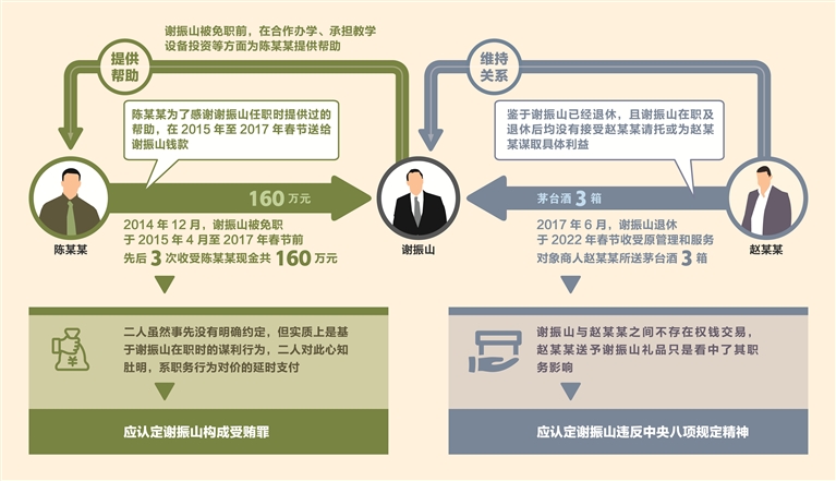 赵春玲:经查,谢振山被免职后,于2015年4月至2017年春节前,先后3次收受陈某某现金共160万元;谢振山退休后,于2022年春节收受原管理和服务对象商人赵某某所送茅台酒3箱。因上述行为发生在谢振山退出领导岗位后,我们着重从谢振山与二人的平日交往、有无经济往来、收受时间、往来缘由、是否有谋利事项等方面收集固定证据。最终查明,160万元系陈某某为感谢谢振山在任时提供的帮助而送,应认定谢振山收受160万元的行为构成受贿罪;谢振山在退休后收受赵某某为了维持关系而送的茅台酒,应认定为违反中央八项规定精神。