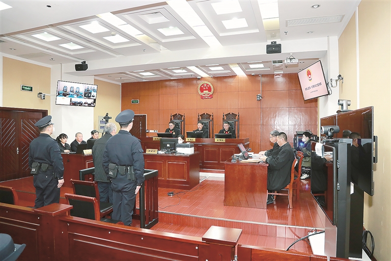 图为2023年2月1日,谢振山涉嫌受贿罪、利用影响力受贿罪案一审庭审现场。(安阳市中级人民法院供图)