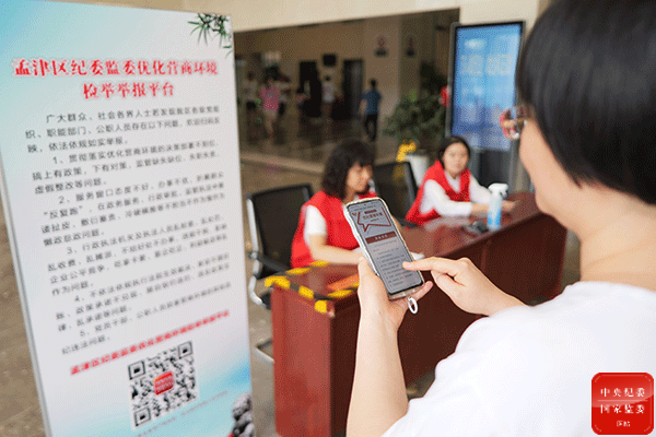 为了方便办事群众反映问题,河南省洛阳市孟津区纪委监委在区政务服务大厅设立优化营商环境检举举报平台,前来办事人员可以通过手机扫码实现问题“码上反映”“一键直达”。(河南省洛阳市孟津区纪委监委 吕晓鹏摄)