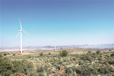 图为近日在南非北开普省德阿镇拍摄的德阿风电项目风机,该项目由中国国家能源集团龙源电力南非公司2017年建成投运,总投资约25亿元人民币,总装机容量24.45万千瓦。 新华社记者 董江辉 摄