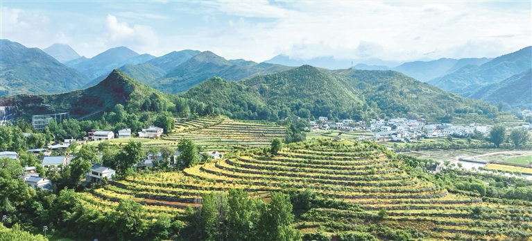 蓝天为幕,青山着色,我被眼前的景致惊艳到了,不停地聚焦相机镜头,记录下这美丽的乡间景致。同行者几乎同时想到了《桃花源记》,笔下的“诗和远方”,不觉感喟,如今的山村太美了,比世外桃源还要美。