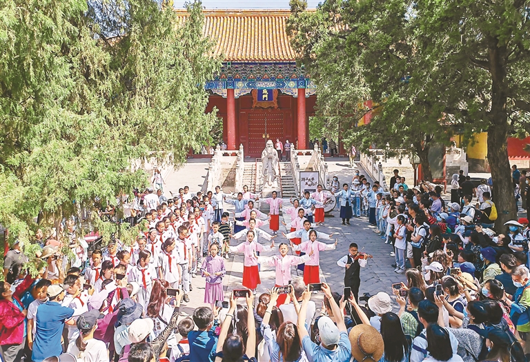 2023年5月18日,北京,国际博物馆日,孔庙举办集体诵读活动,观众重温儒家经典《礼运大同篇》。 图片来源:视觉中国