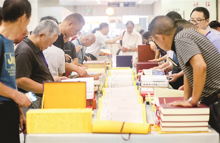 7月23日,华夏晒谱节暨湖北第十四届晒谱节在位于武汉的湖北省图书馆开幕,来自全国各地的谱牒文化专家和谱牒文化爱好者、民间家谱收藏爱好者聚在一起,在一本本家谱中探寻一个个家族的形象缩影和精神家园。图为观众参观家谱展览。 图片来源:视觉中国